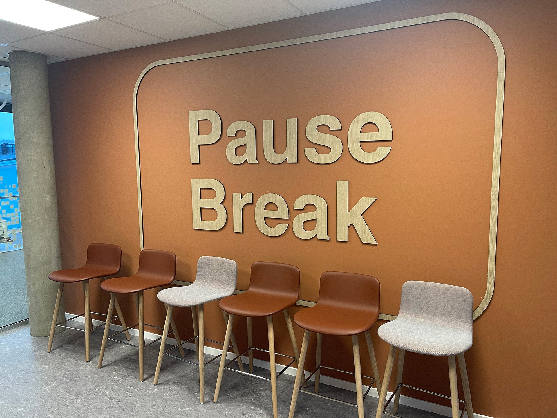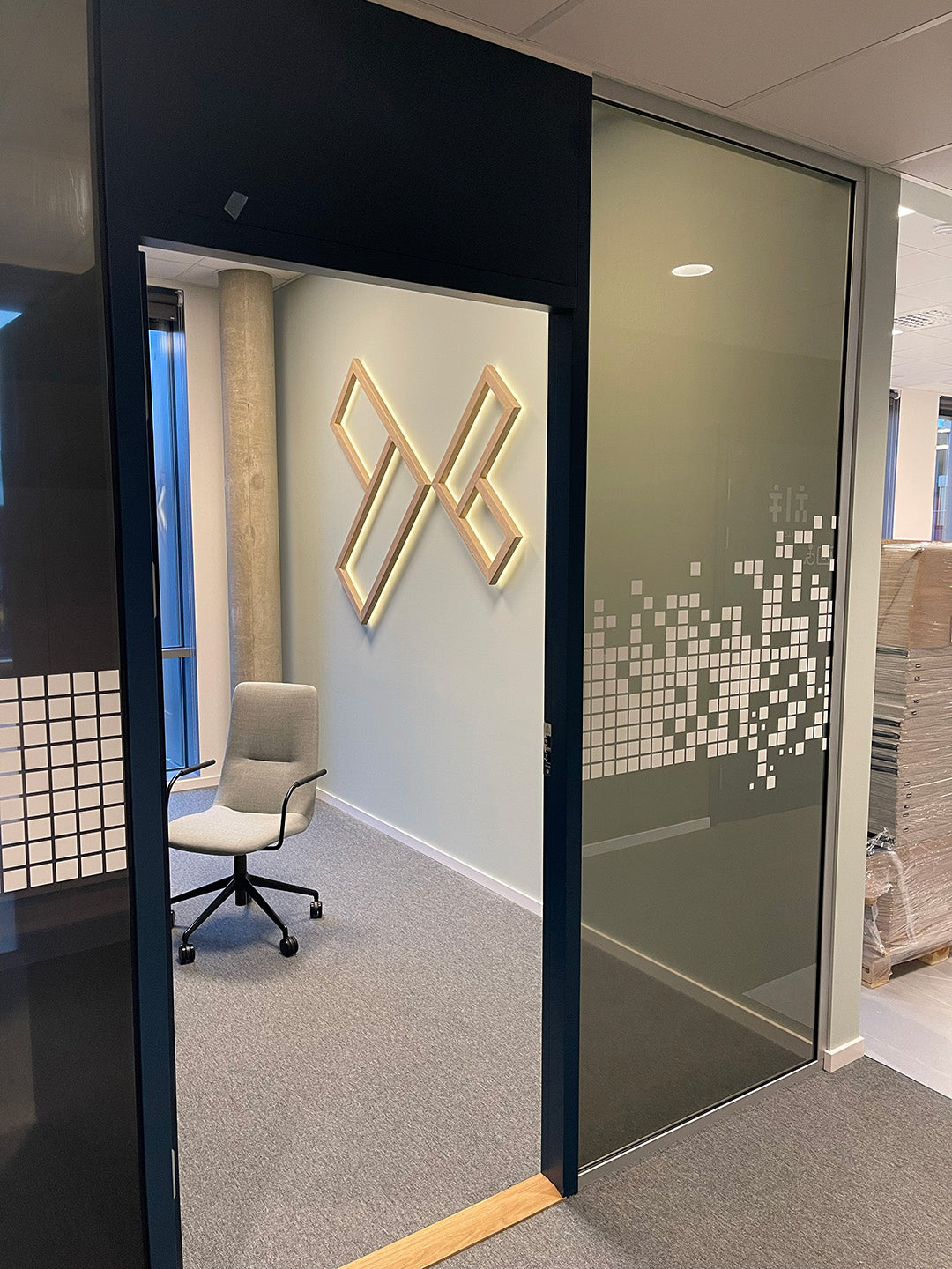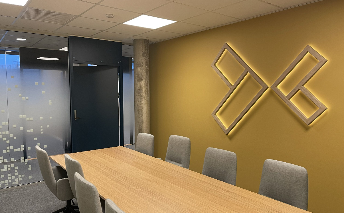 Leveransen besto av unike elementer, fra logolamper og formskjærte plateskilt til smartfilm på møterom. BK var kreativ sparringspartner på materialvalg, planlegging og gjennomføring gjennom hele prosjektet.